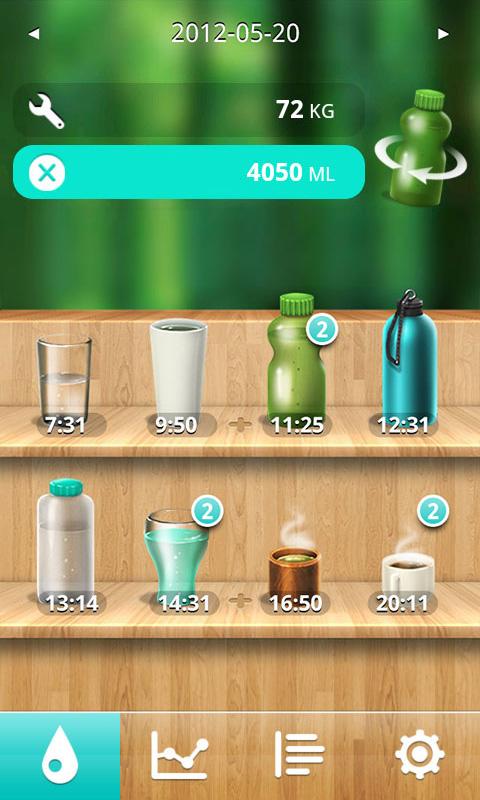 Sovellukseen kirjataan oma paino, jonka mukaan se laskee kuinka paljon vettä keho tarvitsee vuorokaudessa ja ilmoittelee sitten välistä että koska pitäisi muistaa juoda! Erilaisia kuppeja ja pulloja on jo valmiiksi varastossa, joiden mukaan voi juomisiaan ohjelmaan merkata, mutta näitä kuppejen kokoja voi myös muokkailla itse, jolloin saa juuri oikeat määrät juomisia merkattua.